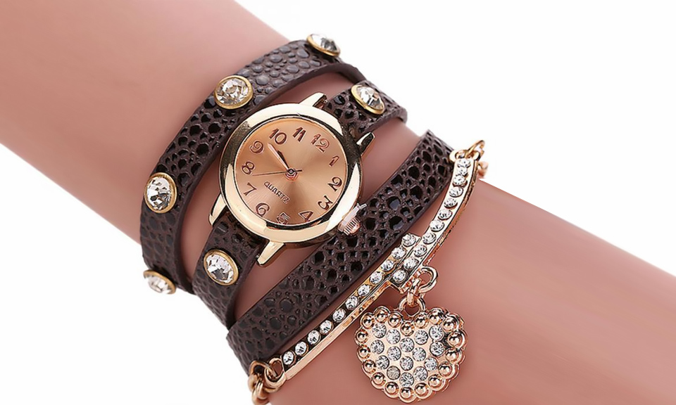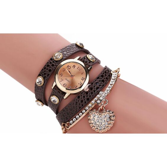 Ρολόι χειρός με Retro χρυσό Καντράν και μεγάλο λουράκι με φολιδωτό σχέδιο και μενταγιόν καρδιά με στράς.