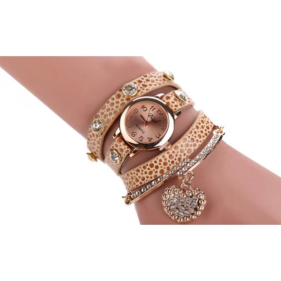 Ρολόι χειρός με Retro χρυσό Καντράν και μεγάλο λουράκι με φολιδωτό σχέδιο και μενταγιόν καρδιά με στράς.