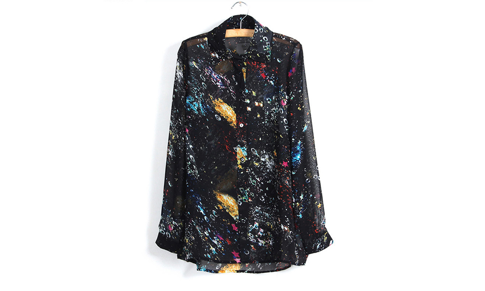 Mοναδική Πουκαμίσα σιφόν με Galaxy τύπωμα, άκρως θηλυκή που αναδεικνύει το σώμα, ιδανική να φορεθεί ανοιχτή και ως ζακέτα.