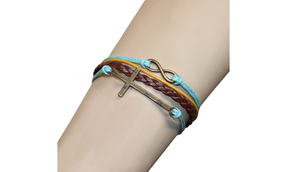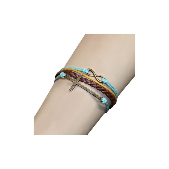 Βραχιόλι από δερματίνη και κλωστές με μεταλλικά διακοσμητικά στοιχεία. Διαθέτει αλυσίδα στο κούμπωμα για να προσαρμόζει σε όλα τα μεγέθη καρπών. Χαρακτηριστικά: Διαστάσεις: 17cm + 4cm αλυσίδα Υλικό: Οικολογικό δέρμα, Κλωστή και Μεταλλικά διακοσμητικά στοιχεία