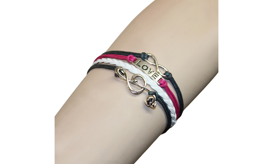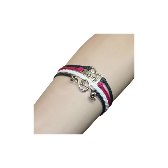 Βραχιόλι από δερματίνη και κλωστές με μεταλλικά διακοσμητικά στοιχεία. Διαθέτει αλυσίδα στο κούμπωμα για να προσαρμόζει σε όλα τα μεγέθη καρπών. Χαρακτηριστικά: Διαστάσεις: 17cm + 4cm αλυσίδα Υλικό: Οικολογικό δέρμα, Κλωστή και Μεταλλικά διακοσμητικά στοιχεία