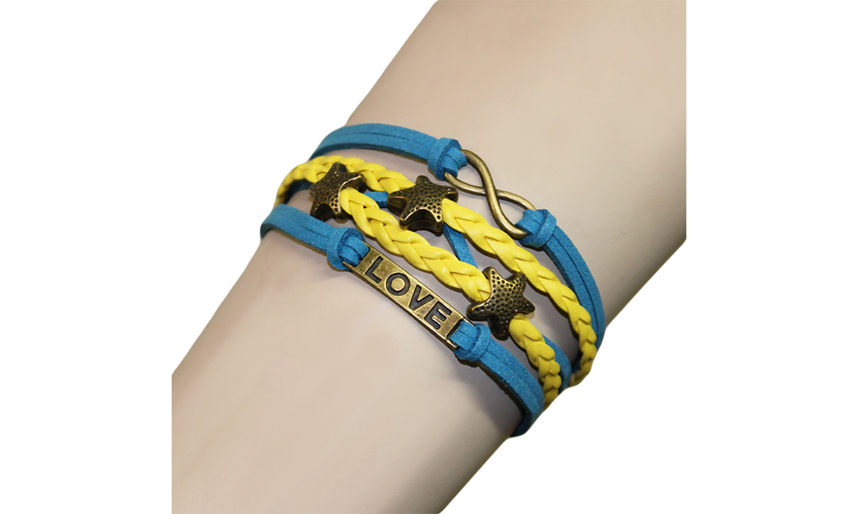 Βραχιόλι από δερματίνη και κλωστές με μεταλλικά διακοσμητικά στοιχεία.